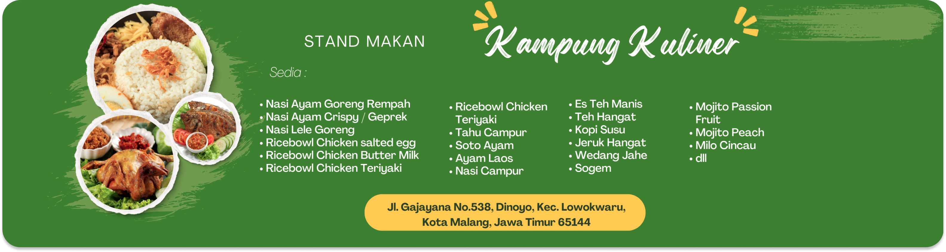 Kampung Kuliner merupakan salah satu tempat kuliner yang berada di kawasan Dinoyo, Kec. Lowokwaru, Kota Malang. Kami menyediakan berbagai jenis makanan dan minuman yang beraneka ragam dari makanan tradisional hingga modern. Dengan konsep tempat yang nyaman dan menu yang bervariasi, Kampung Kuliner menjadi pilihan tepat untuk nongkrong bersama keluarga, teman, atau rekan bisnis.